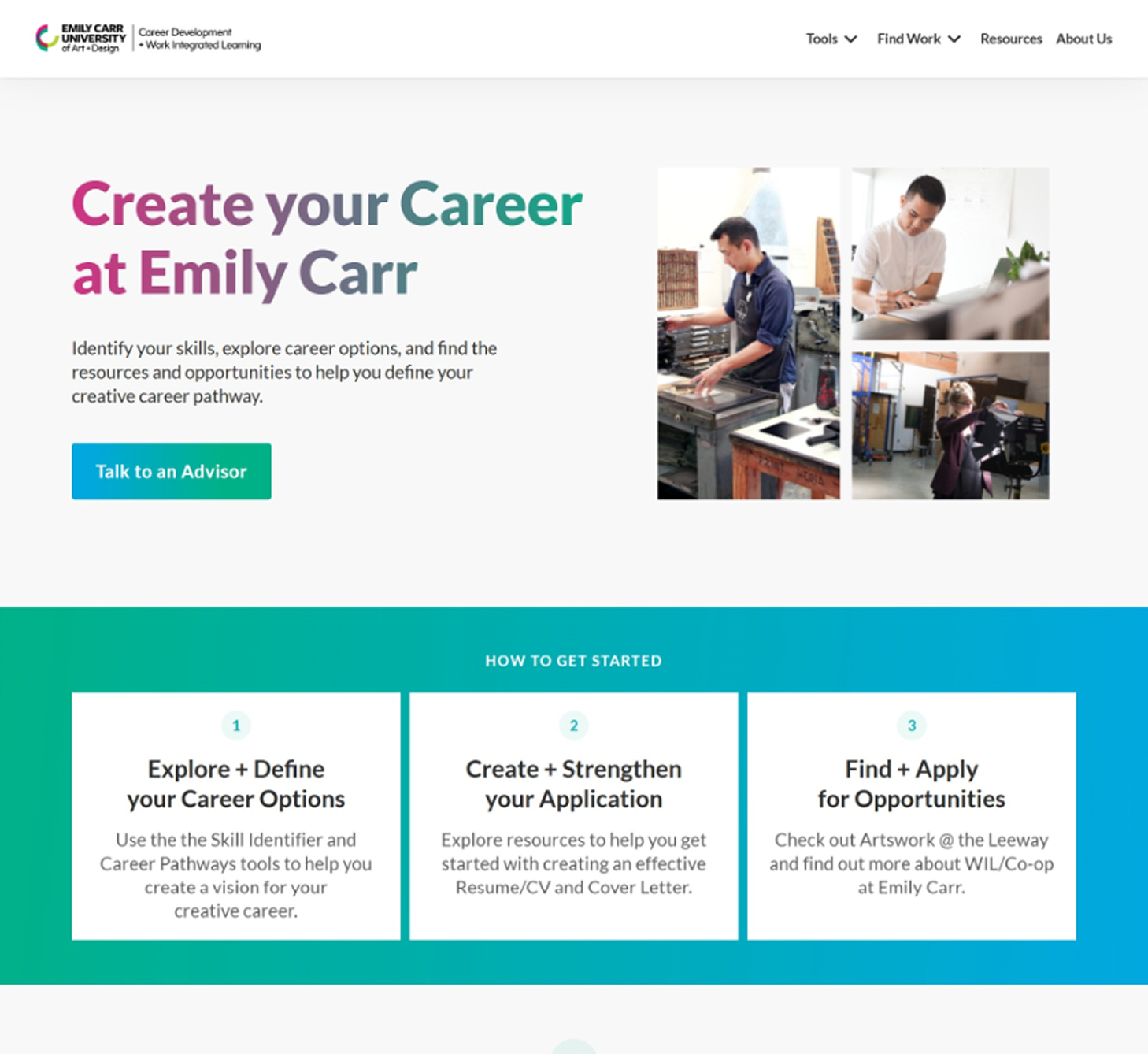 The Career Development + WIL Office provides career advising and career-related programming for students and alumni. The office discovered that valuable career resources were siloed and dispersed across multiple university departments. To address this, they envisioned a centralized website that would serve as a comprehensive hub for all career resources.