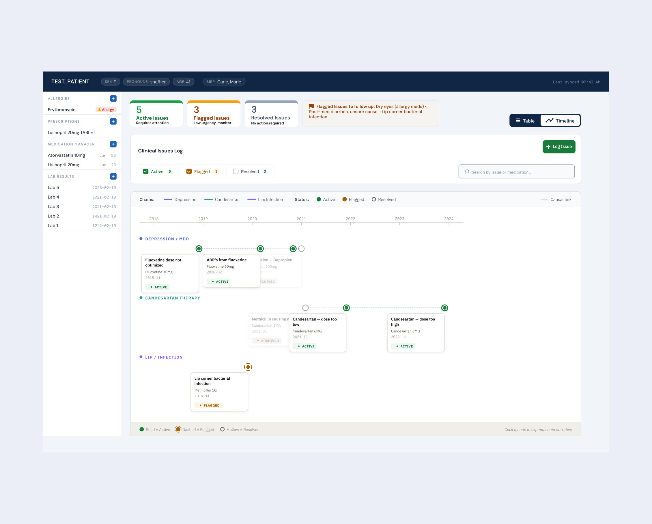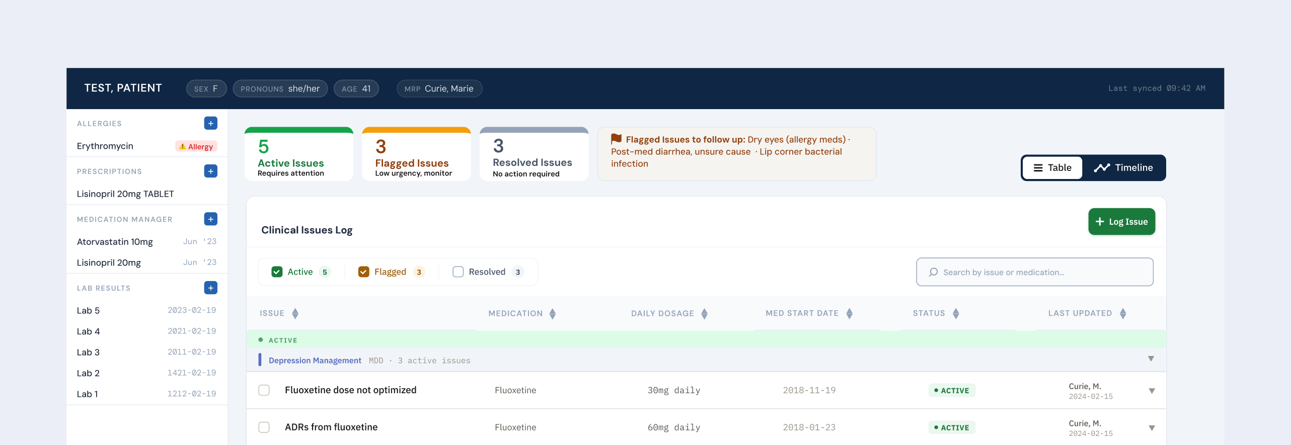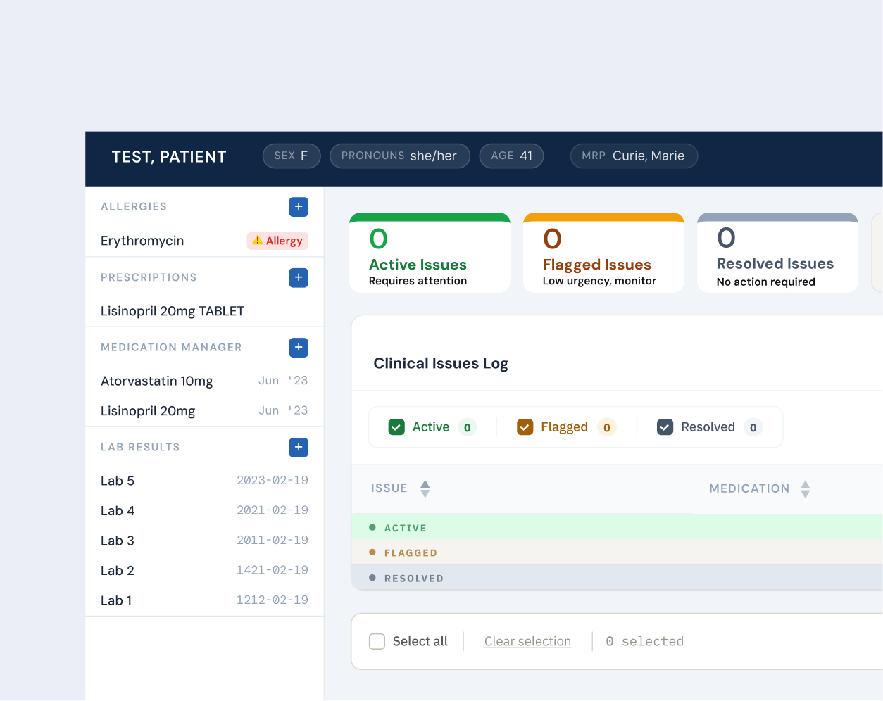 Provides an overview of issue statuses, reinforces what each status means, and guides clinicians towards where their attention is needed most.