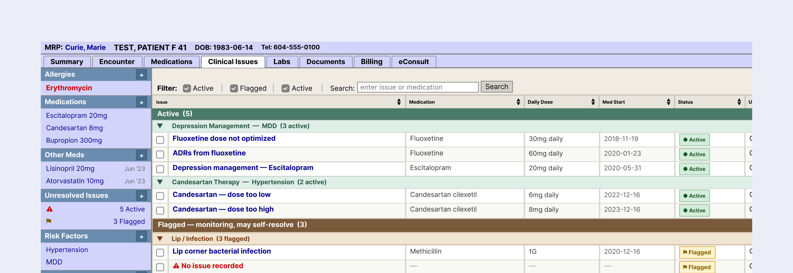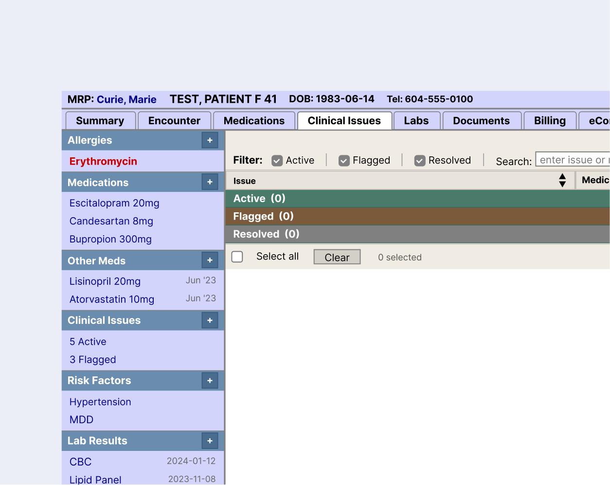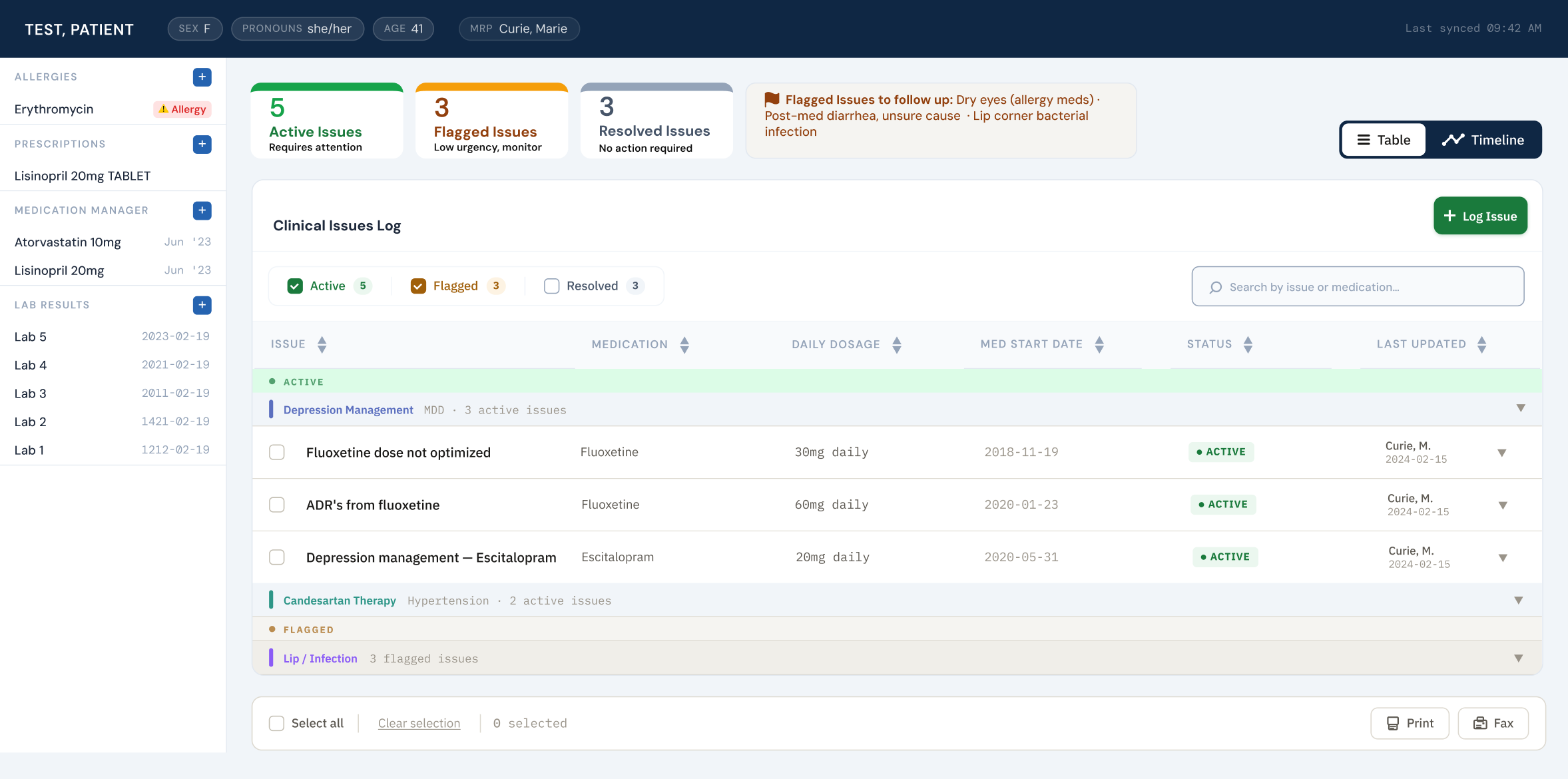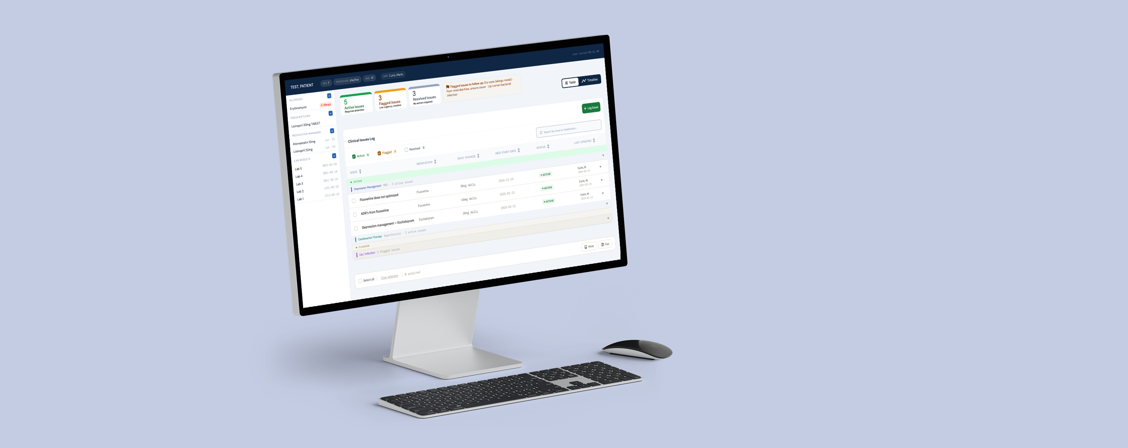 Provides an overview of issue statuses, reinforces what each status means, and guides clinicians towards where their attention is needed most.