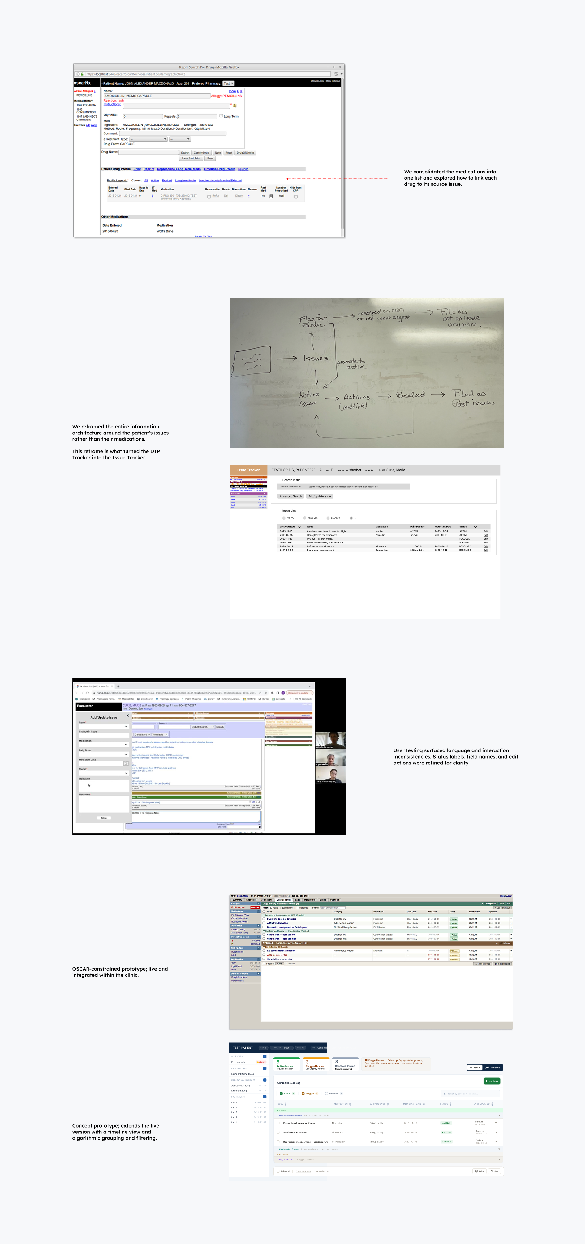 After evaluating OSCAR, we identified two core issues: poor information hierarchy and workflow misalignment. Poor layout, unclear status indicators, and the system not reflecting the realities of clinical documentation made it difficult to prioritize, track, and resolve DTPs over time.