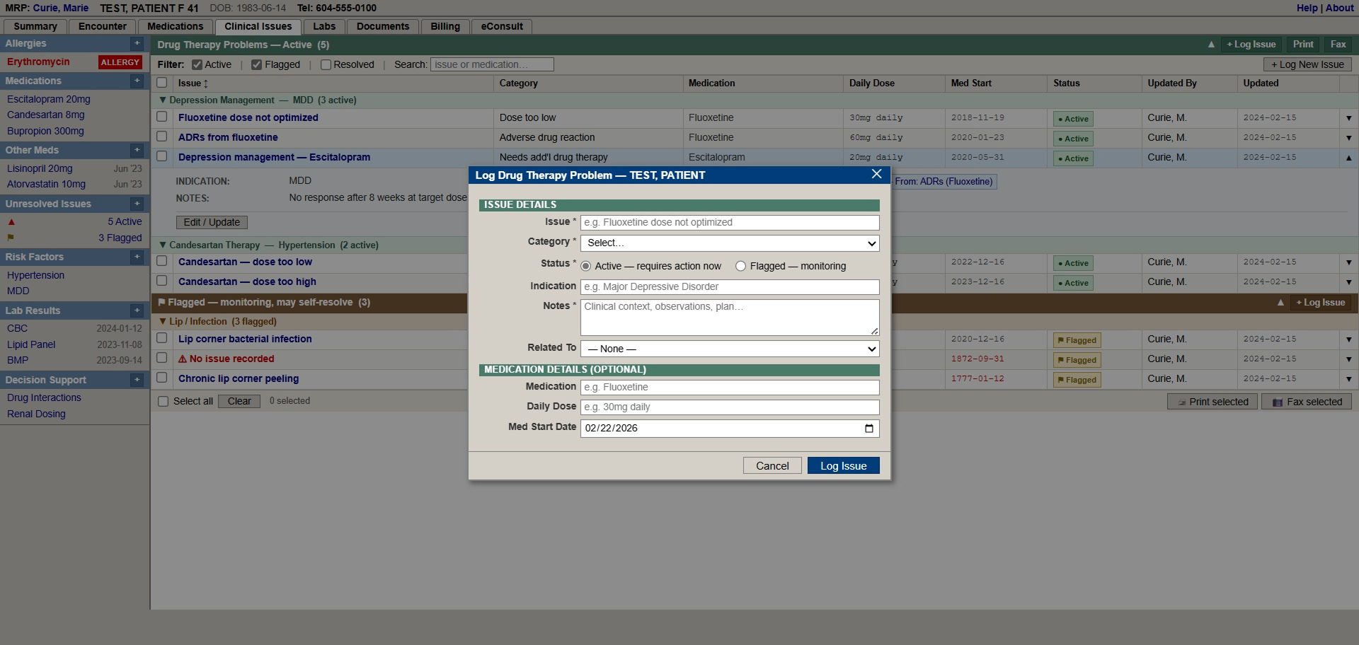 OSCAR is the open-source electronic medical records system (EMR) used at UBC Pharmacists Clinic, and it was built for physicians. Physicians and pharmacists have very different workflows and as a result, pharmacists at the clinic lacked a dedicated way to record, track, and resolve drug therapy problems (DTPs). DTPs are issues that arise when medication use leads to less-than-optimal patient outcomes.