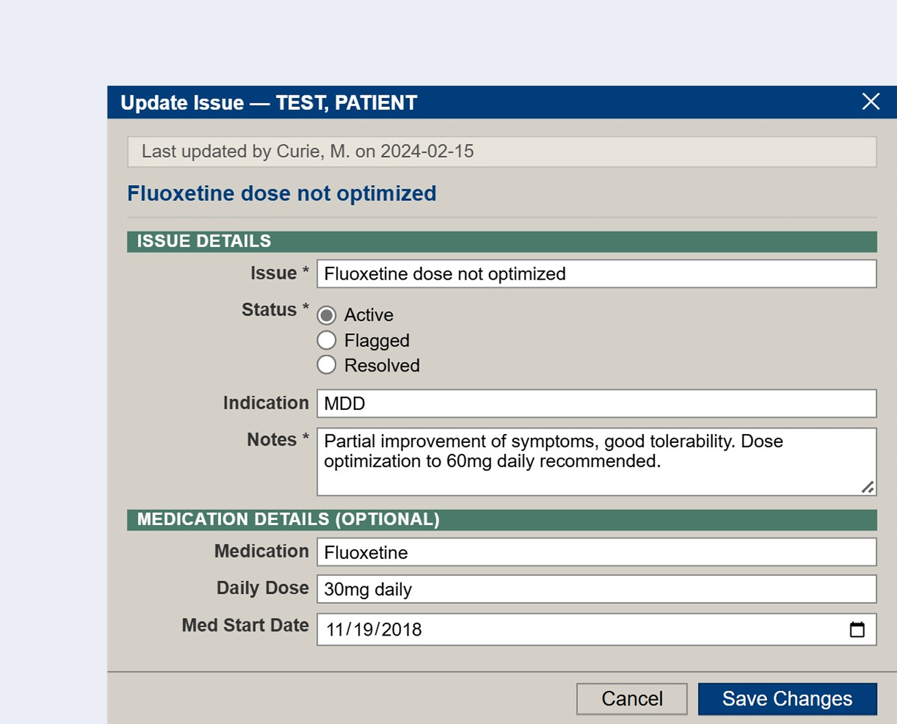 In clinical practice, why a medication was prescribed and why a patient remains on it or how they experienced it over time are two different things and both matter. This form captures both.